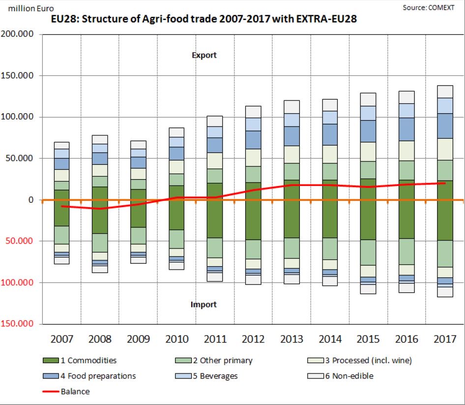 Σε 137,9 δισεκατομμύρια ευρώ αποτιμώνται οι εξαγωγές ευρωπαϊκών αγροτικών προϊόντων το 2017, σημειώνοντας αύξηση 5,1% σε σύγκριση με το 2016. Η περιοχή, η οποία απορρόφησε τις μεγαλύτερες ποσότητες ήταν η Αμερική όπου το σύνολο των εξαγωγών ανήλθε σε 1,22 δισεκατομμύρια ευρώ και ήταν αυξημένο κατά 6% σε σύγκριση με πέρυσι. Ακολούθησε η Ρωσία, η οποία απορρόφησε αγροτικά προϊόντα συνολικής αξίας 892 εκατομμυρίων ευρώ, σημειώνοντας αύξηση 16% σε σύγκριση με το 2016. Τη σκυτάλη πήραν στη συνέχεια οι Ασιατικές αγορές με την Ιαπωνία (645 εκατ. ευρώ και αύξηση 11%), την Κίνα (591 εκατ. ευρώ και αύξηση 5%), το Χονγκ Κονγκ (366 εκατ. ευρώ και αύξηση 10%) και την Κορέα (341 εκατ. ευρώ και αύξηση 13%). Τα παραπάνω στοιχεία προκύπτουν από την Ευρωπαϊκή Επιτροπή, η οποία επεξεργάστηκε δεδομένα από τις 28 χώρες μέλη της Ε.Ε.