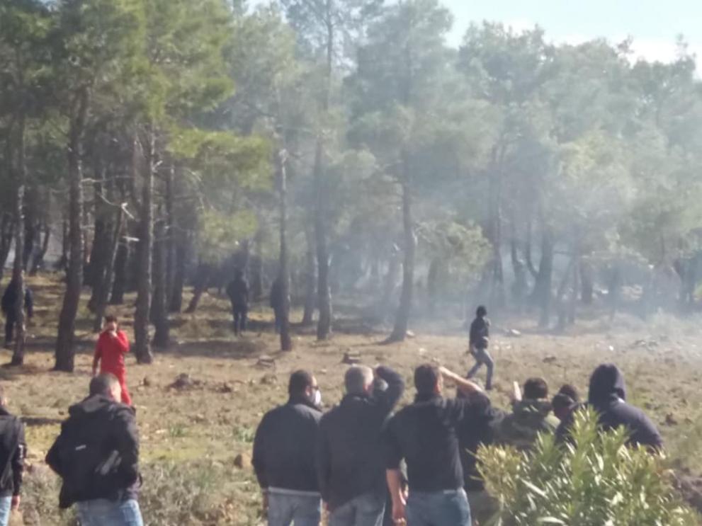 Σύμφωνα με το stonisi.gr, η φωτιά στο δάσος στην περιοχή Καραβάς ξέσπασε από τις συνεχείς ρίψεις χειροβομβίδων κρότου-λάμψης και δακρυγόνων που εκτόξευσαν άνδρες των ΜΑΤ.