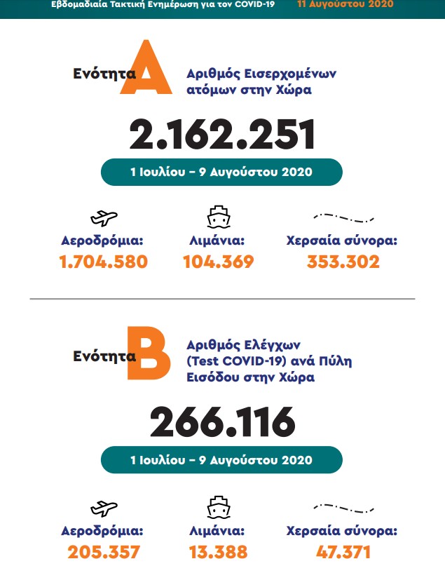 Όσον αφορά τα κρούσματα και τους ελέγχους στις πύλες εισόδου της χώρας από την 1η Ιουλίου έως την 9η Αυγούστου έχουν πραγματοποιηθεί 266.116 μοριακά τεστ σε 2.162.251 εισερχόμενους πολίτες στη χώρα και διαπιστώθηκαν 508 ενεργά κρούσματα κοροναϊού.