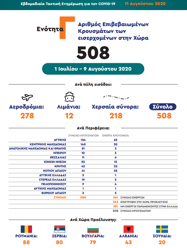 Από τα 508 κρούσματα που εντοπίστηκαν στις πύλες εισόδου, από αυτά 164 παραμένουν ενεργά, 243 επέστρεψαν στις χώρες τους, ενώ 101 είναι πλέον μη ενεργοί και παραμένουν στην χώρα μας.