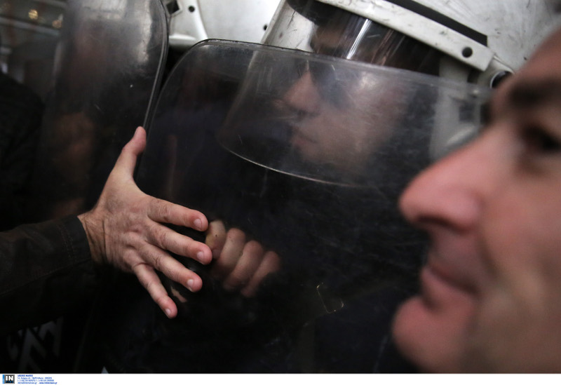 Εξω από το ΥΠΟΙΚ έφτασε η πορεία των εργαζόμενων στα δημόσια νοσοκομεία και δεν άργησε να σημειωθεί ένταση με τα ΜΑΤ. Οι εργαζόμενοι προσπάθησαν να μπουν στο κτίριο του υπουργείου, ωστόσο οι αστυνομικοί τους το απαγόρευσαν.