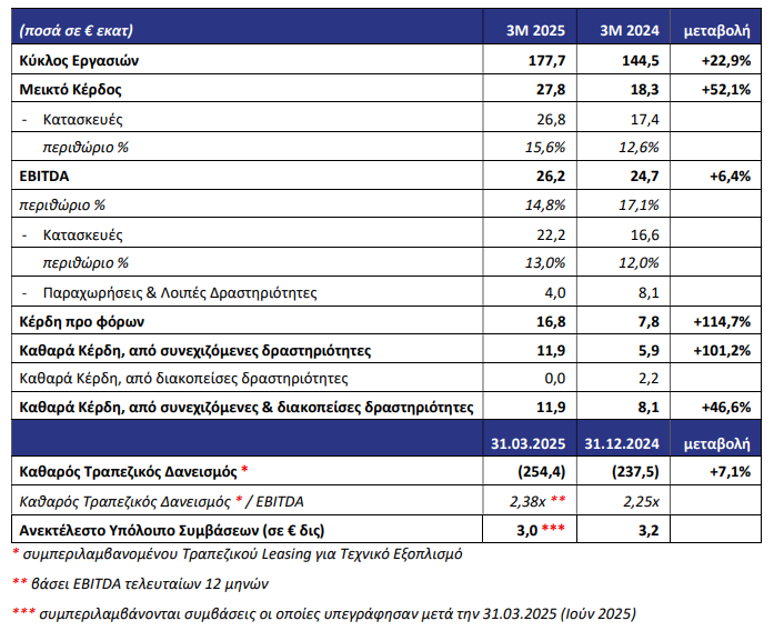 Αναλυτικά, σύμφωνα με τις οικονομικές καταστάσεις για το α’ τρίμηνο του 2025, ο ενοποιημένος κύκλος εργασιών του ομίλου αυξήθηκε κατά 22,9% σε €177,7 εκατομμύρια έναντι €144,5 εκατομμυρίων στο αντίστοιχο τρίμηνο του 2024. Ο αυξημένος κύκλος εργασιών του τρέχοντος έτους οφείλεται στο γεγονός ότι τα νέα έργα μπαίνουν σε φάση πλήρους εκτέλεσης.