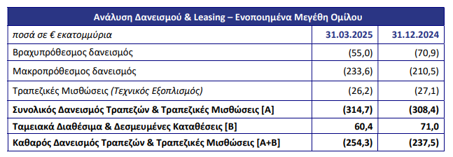 Ο καθαρός τραπεζικός δανεισμός του ομίλου (συμπεριλαμβανομένων των υποχρεώσεων από leasing εξοπλισμού) αυξήθηκε κατά €16,9 εκατομμύρια σε €254,3 εκατομμύρια την 31.03.2025, από € 237,5 εκατομμύρια την 31.12.2024, αλλά ο δείκτης μόχλευσης (Καθαρός Δανεισμός / EBITDA) παραμένει ιδιαίτερα χαμηλός στο 2,38x. Η μικρή αύξηση του δανεισμού οφείλεται στην καταβολή της συμμετοχής των κεφαλαίων του ΣΔΙΤ Κεδρηνός Λόφος (Flyover Θεσσαλονίκης) και στην αύξηση του Κεφαλαίου Κίνησης, λόγω της αύξησης του τζίρου.