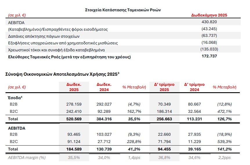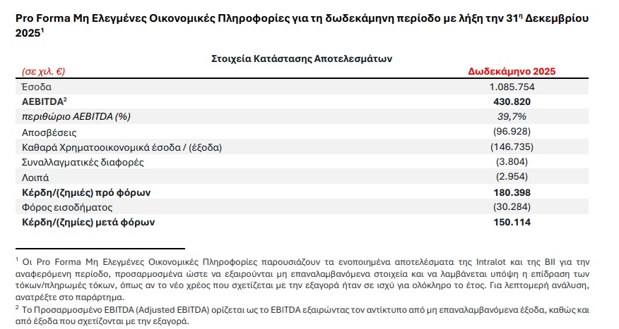 Σε pro forma βάση, η συνολική απόδοση του νέου ενοποιημένου οργανισμού για το 2025 διαμορφώνεται σε έσοδα 1,086 δισ. ευρώ και EBITDA 430,8 εκατ. ευρώ, με περιθώριο 39,7%, επιβεβαιώνοντας τις αρχικές εκτιμήσεις της διοίκησης.