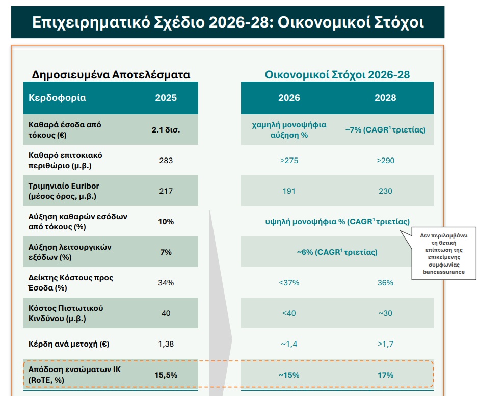 Αντλώντας οφέλη από την ισχυρή αυτή επίδοση, οι στρατηγικοί μας στόχοι, όπως αποτυπώνονται στο νέο επιχειρηματικό μας σχέδιο για την περίοδο 2026-2028, σηματοδοτούν το επόμενο στάδιο πειθαρχημένης ανάπτυξης και διαρκούς δημιουργίας αξίας. Φιλοδοξούμε να επιτύχουμε υψηλή αλλά διατηρήσιμη απόδοση ενσώματων ιδίων κεφαλαίων (RoTE), η οποία αναμένεται να ανέλθει σε 17% στο τέλος του 2028, αξιοποιώντας τις ευνοϊκές μακροοικονομικές συνθήκες προκειμένου να επιταχύνουμε την καθαρή πιστωτική επέκταση σε επίπεδα άνω των €10 δισ. εντός της επόμενης τριετίας.