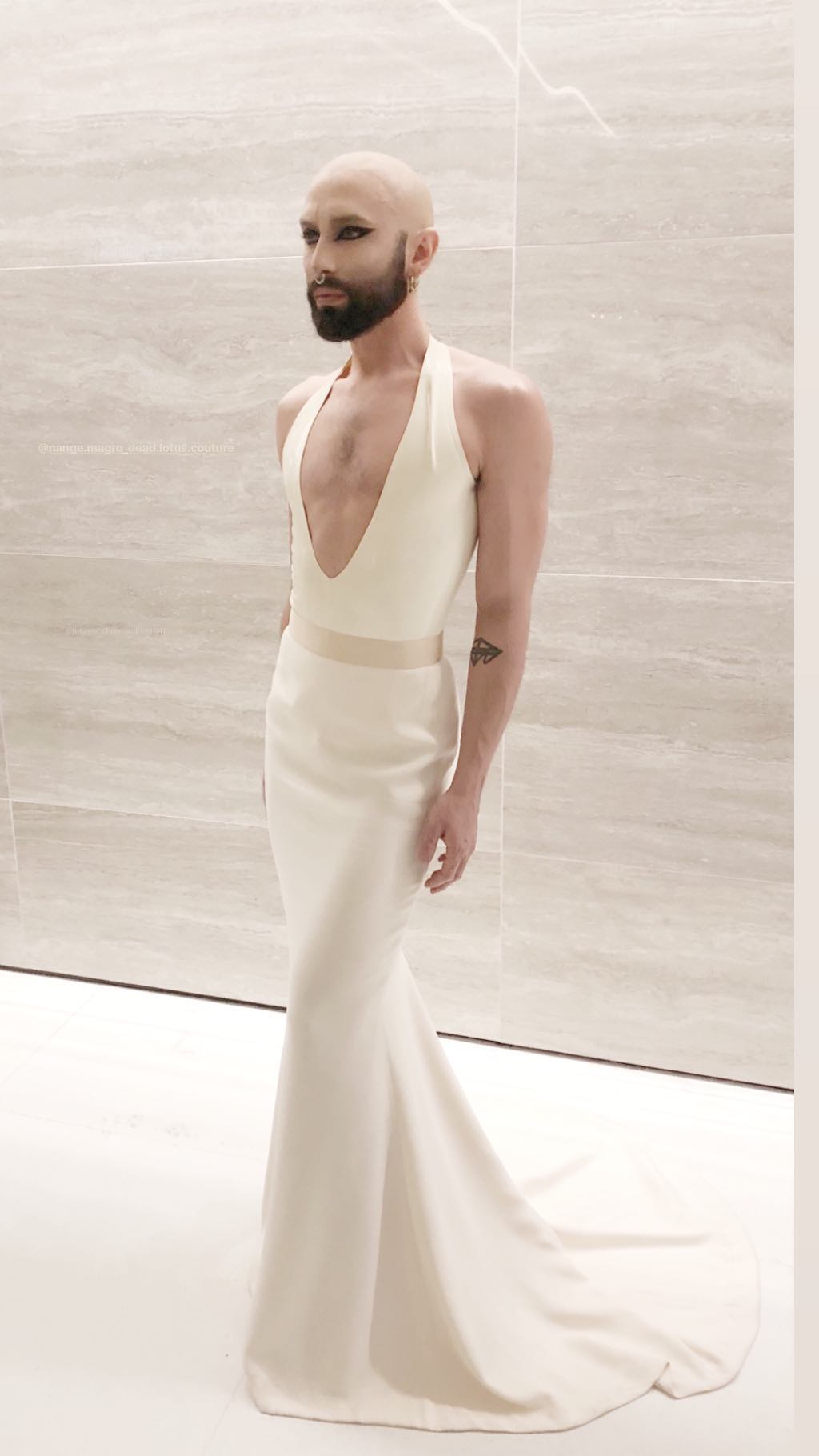 H Κοντσίτα δεν δίστασε να κόψει τα μακριά χαρακτηριστικά μαλλιά της δημιουργώντας μια αρκετά πιο αρρενωπή εικόνα επιλέγοντας όμως ένα ολόλευκο φόρεμα, ενώ δεν δίστασε να ποζάρει για τις κάμερες.