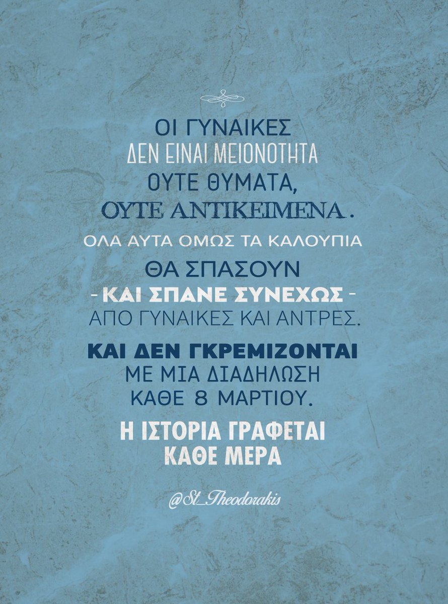 «Και δεν γκρεμίζονται με μια διαδήλωση κάθε 8 Μαρτίου. Η ιστορία γράφεται κάθε μέρα» καταλήγει.