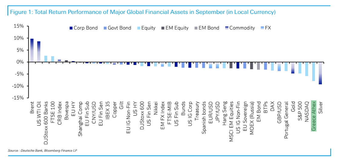 «Κατά τη διάρκεια του γ’ τριμήνου, μόλις 11 από τις από τα 38 μη νομισματικά περιουσιακά στοιχεία που παρακολουθούμε ήταν σε θετικό έδαφος και το Σεπτέμβριο, μόνο 7 ήταν θετικά, καθιστώντας το Σεπτέμβριο, μέχρι στιγμής, το χειρότερο μήνα του 2023», εξηγούν οι Henry Allen και Jim Reid της Deutsche Bank.