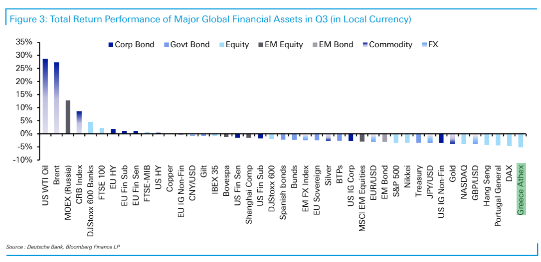 Τόσο ο Σεπτέμβριος, όσο και το γ’ τρίμηνο, είχαν κακές επιδόσεις για το Χρηματιστήριο Αθηνών αλλά και τις αγορές συνολικά, σύμφωνα με τη μηνιαία ανάλυση της γερμανικής τράπεζας Deutsche Bank για τις αποδόσεις των αγορών ανά τον κόσμο . Πάντως το Χ.Α. διατηρεί την υψηλή του επίδοση σε ό,τι αφορά τις αποδόσεις από τις αρχές του έτους καθώς με κέρδη 32,8% έρχεται στη δεύτερη θέση διεθνώς μετά τον ρωσικό ΜΟΕΧ, ο οποίος καταγράφει άνοδο 52,2%.