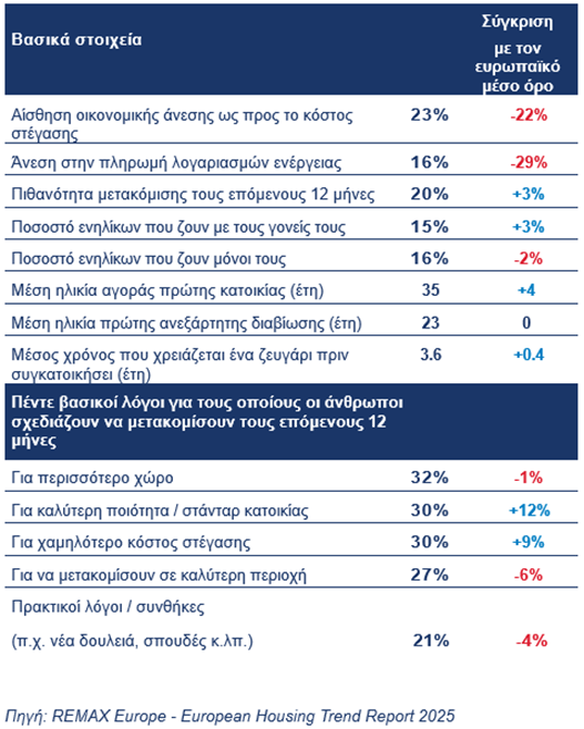 Οι οικονομικές συνθήκες επηρεάζουν και τις στεγαστικές επιλογές των πολιτών. Το 15% των ενηλίκων στην Ελλάδα εξακολουθεί να διαμένει με τους γονείς του (έναντι 12% στην Ευρώπη), με το 59% εξ αυτών να δηλώνει ότι δεν μπορεί να αντεπεξέλθει οικονομικά σε ενοίκιο ή αγορά κατοικίας. Παράλληλα, η απόκτηση πρώτης κατοικίας πραγματοποιείται σε μεγαλύτερη ηλικία, με τον μέσο όρο να ανέρχεται στα 35 έτη, έναντι 31 ετών στην υπόλοιπη Ευρώπη.